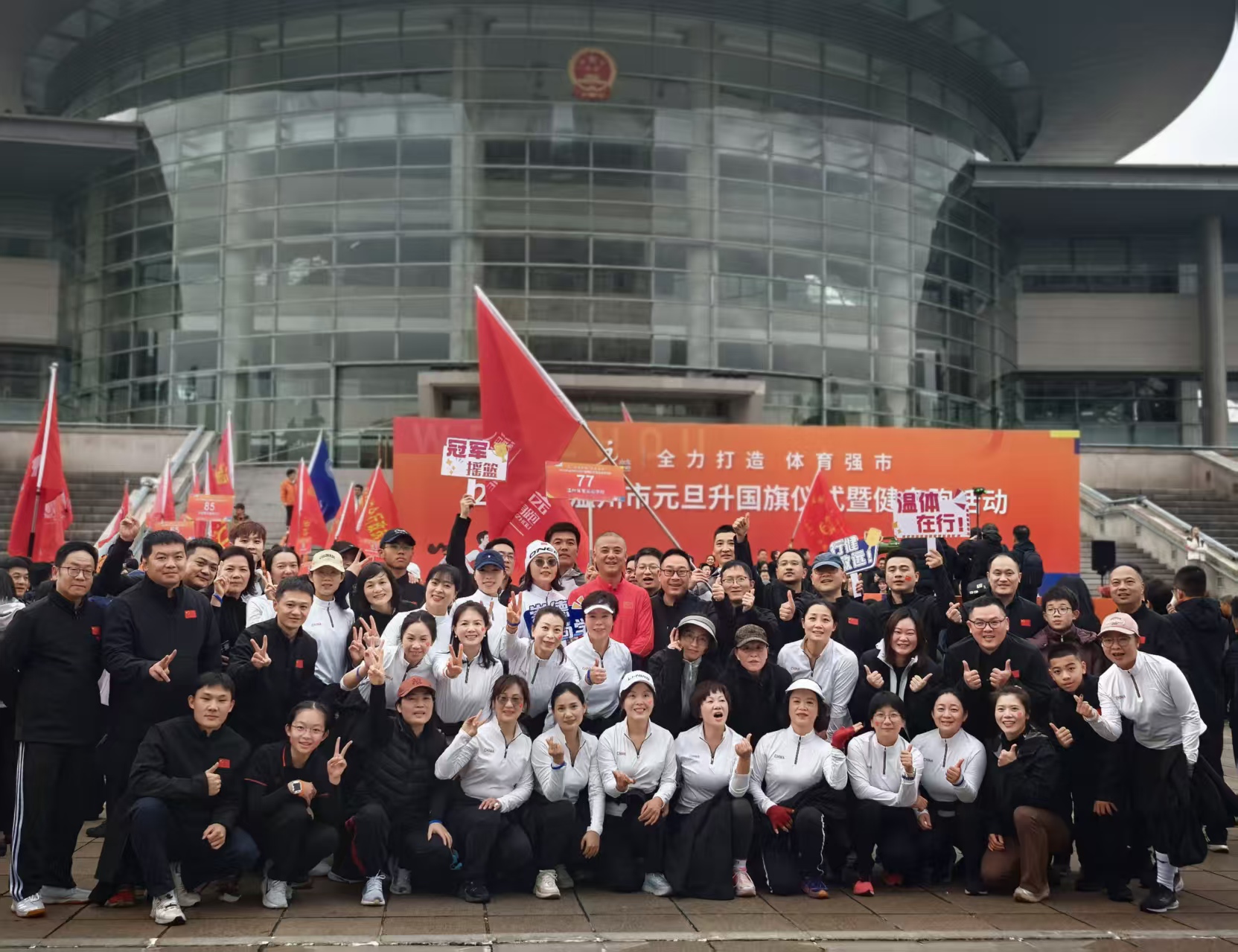1月1日清晨,我校60名教职工齐聚温州市行政中心广场,与全市各界近万名代表一道,以庄严升旗仪式和活力健身跑,共迎新年到来。